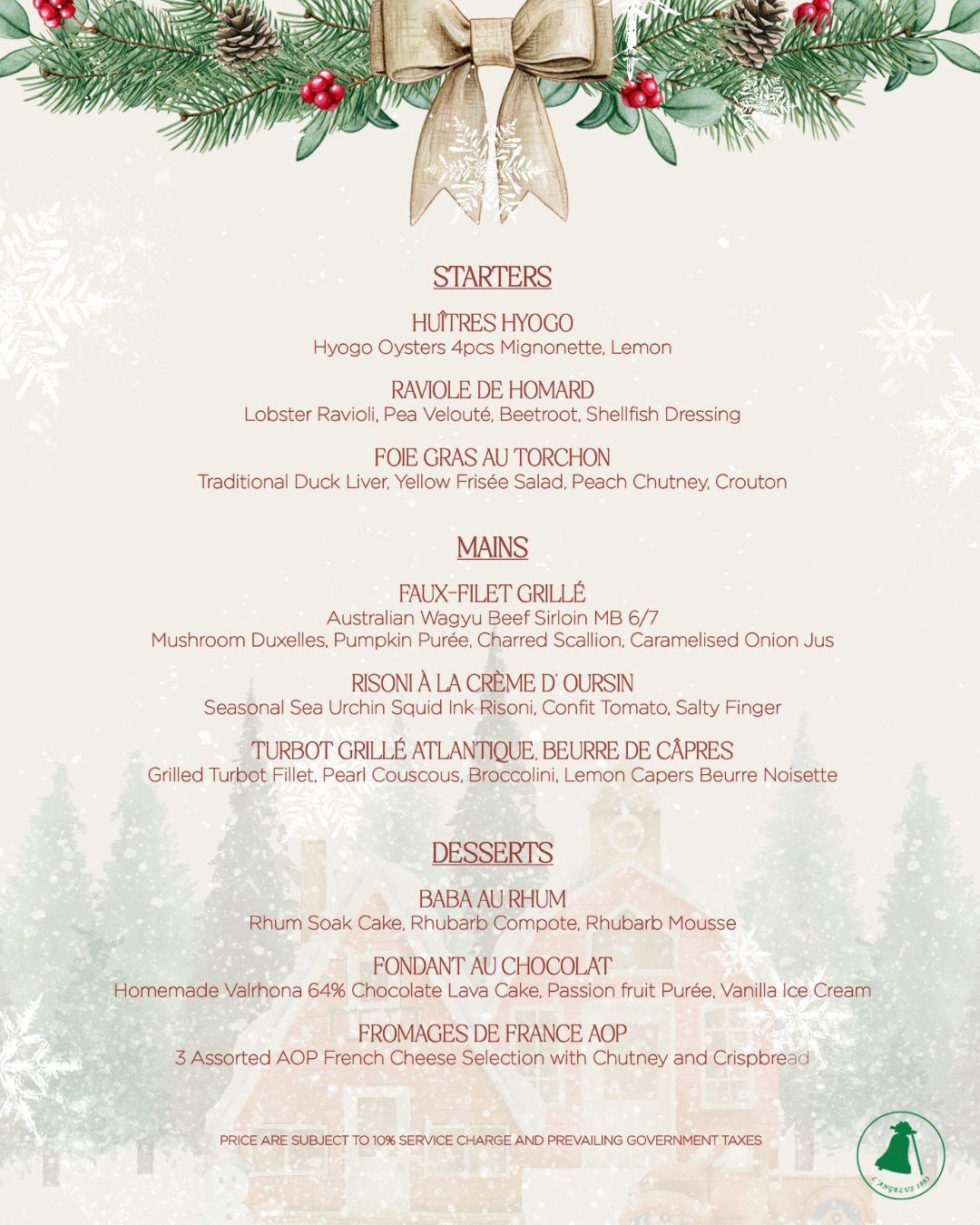 Celebrate the season with L'Angelus's exquisite 3-course festive menu. Indulge in classic French luxury, featuring Hyogo Oysters, Lobster Ravioli, the richness of Wagyu Beef Sirloin (MB 6/7), and the decadent Fondant au Chocolat or a spirited Baba au Rhum.